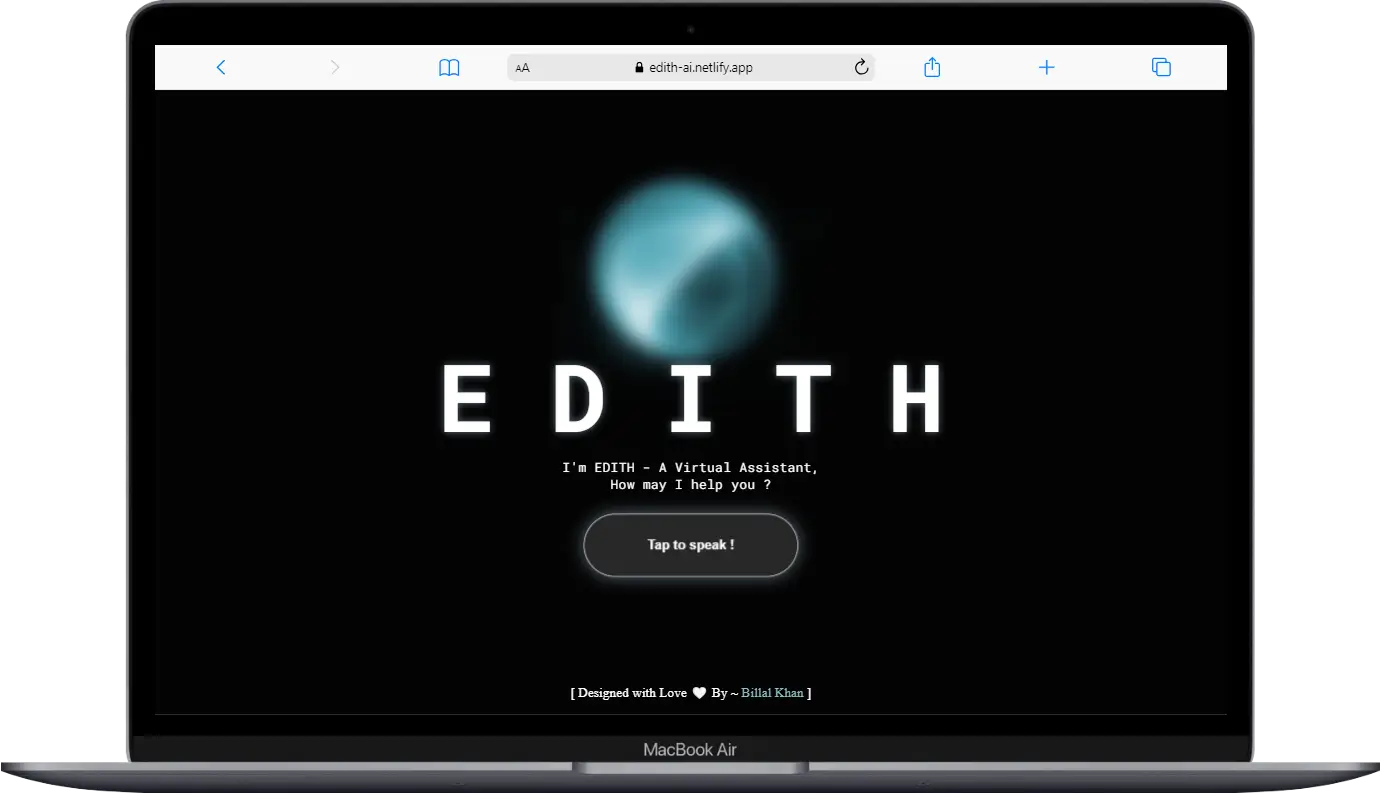 E D I T H - A Virtual Assistant, basically it design to perform some basic functionality like asking Date, Time, to open Facebook, Instagram, Google, asking about someone like SRK, Ronaldo etc.. etc... It is purely made with HTML, CSS, JavaScript.